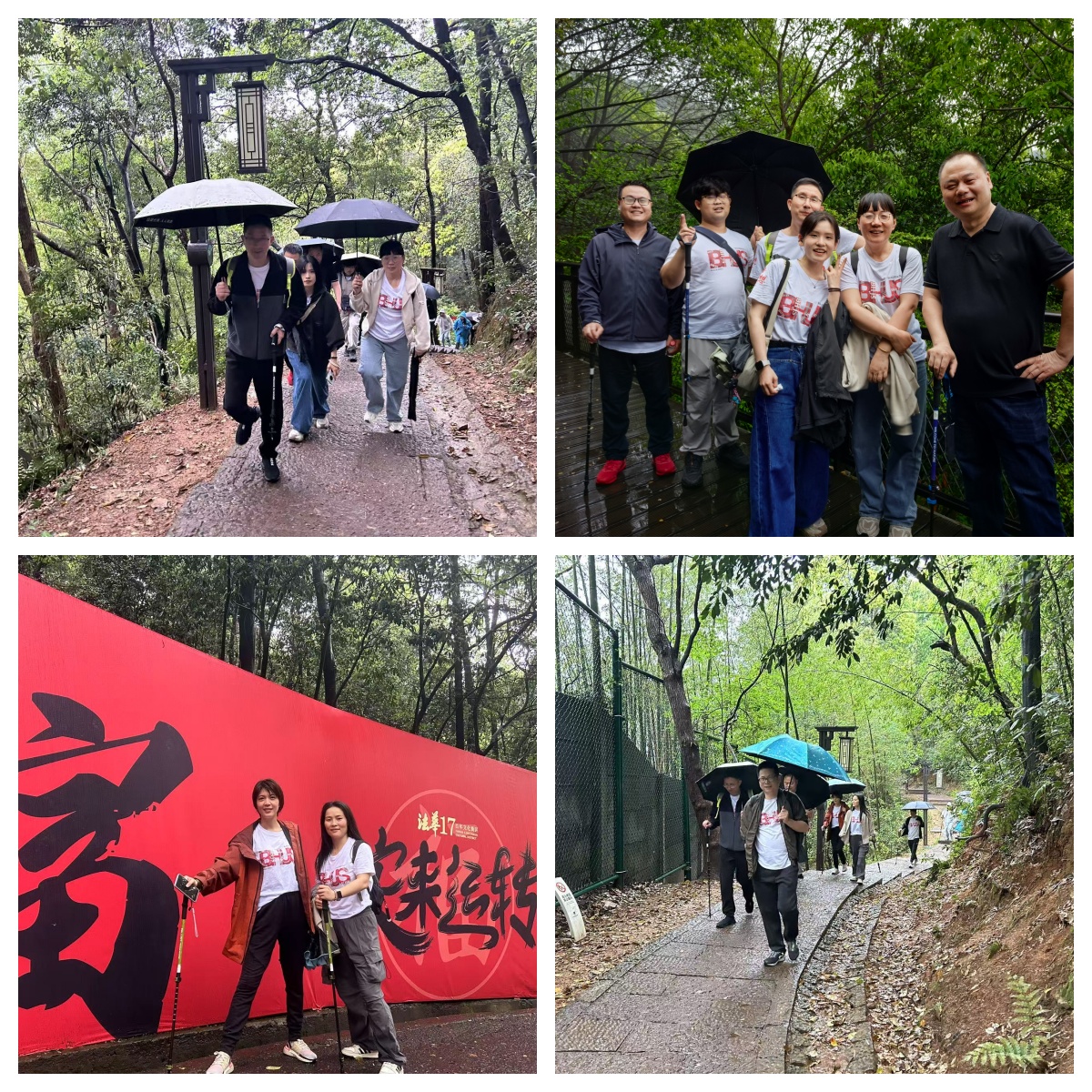 天空不作美,活動當日,天空飄起細雨,但全員熱情不減。員工身著統一文化衫,風雨無阻,整裝待發(fā)。出發(fā)前,工會副主席潘玲玲?作動員講話,講解了徒步登山過程中的安全注意事項及活動游戲規(guī)則,強調“安全第一,團隊協作”,并鼓勵大家用行動詮釋寶恒“傳承、融匯、創(chuàng)新、超越”的企業(yè)精神。隨后,隊伍分為三個小組,在淅瀝雨幕中開啟了全程6.7公里的徒步登山征程。