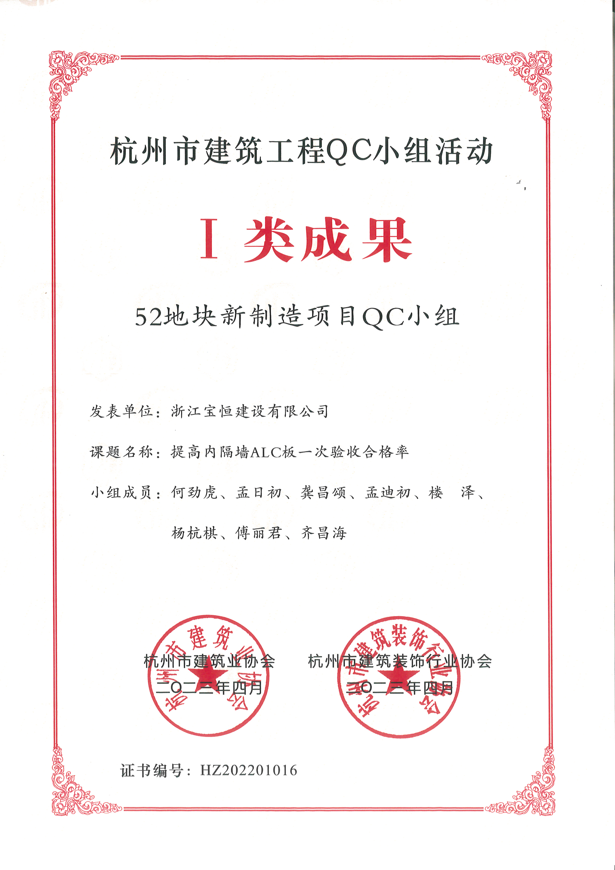 2022年度杭州市建筑工程QC小組活動(dòng)I類(lèi)成果